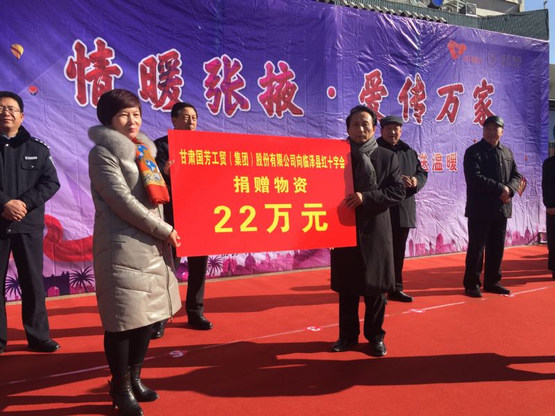 2019年1月11日,甘肅省慈善總會、張掖市慈善協(xié)會、甘州區(qū)慈善協(xié)會以及臨澤縣紅十字會攜甘肅國芳工貿(mào)(集團(tuán))股份有限公司在張掖市中心廣場共同舉行“情暖張掖·愛傳萬家”送健康送溫暖活動,將2000套棉衣,2000余套秋衣秋褲,27臺彩電以及300余件小家電合計價值148萬元的過冬物資帶給山丹縣,民樂縣的困難群眾,將2500個醫(yī)藥箱帶給臨澤縣的老人們。此次活動傳導(dǎo)社會幫扶、精準(zhǔn)扶貧精神的同時也默默為社會傳導(dǎo)著一份正能量。