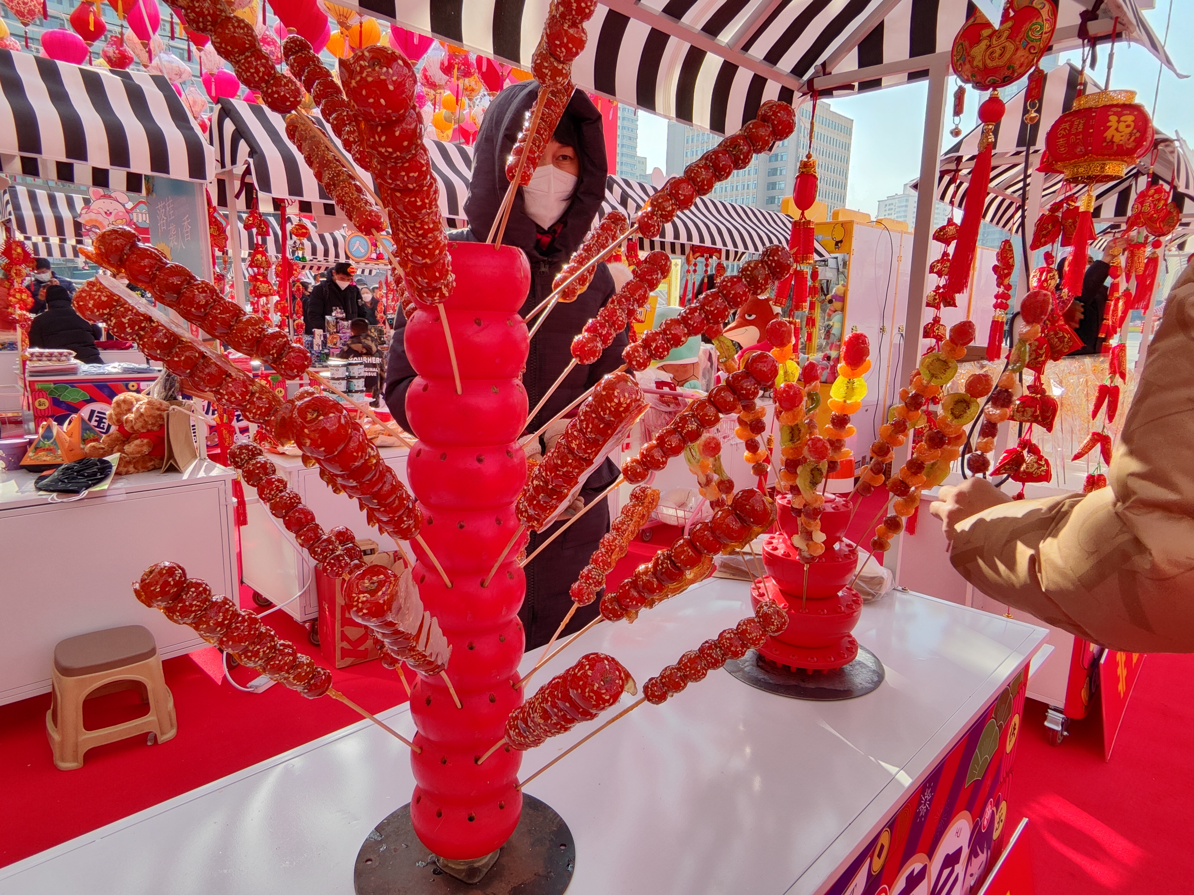 人間煙火處,年味漸濃時(shí)。新疆羊肉串、冰糖葫蘆、臭豆腐、酸辣粉、網(wǎng)紅大面筋,蘭州熱冬果……小吃攤生起騰騰熱氣,飄香十里。